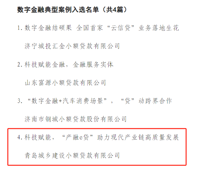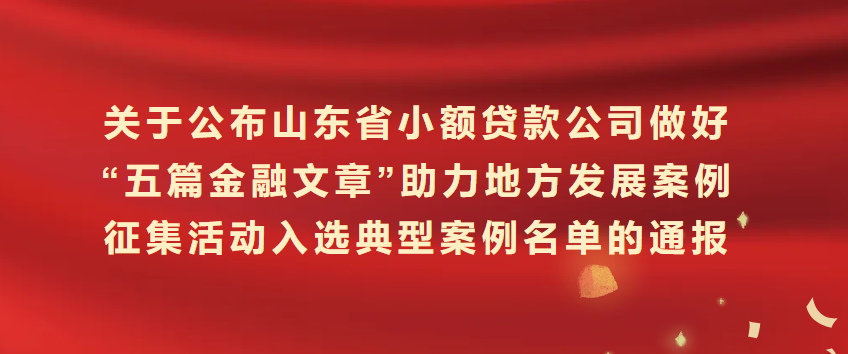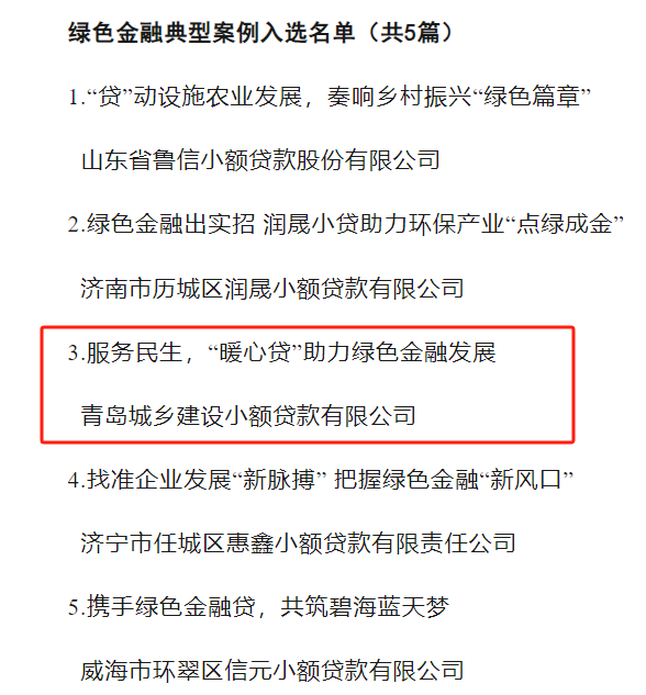 近期,山东省小额贷款企业协会发布《做好“五篇金融文章”助力地方发展案例榜单》,青岛米兰MiLan(中国)城金集团旗下城乡小贷公司暖心贷、产融e贷两项业务分别入选绿色金融典型案例、数字金融典型案例。