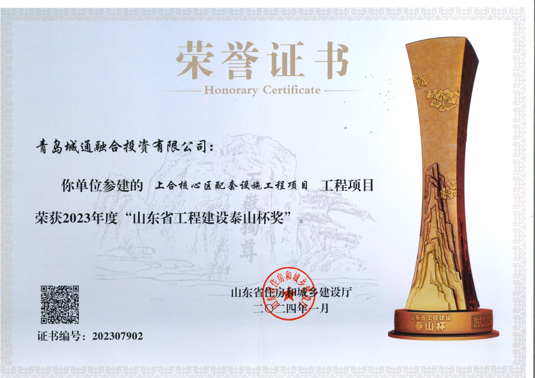5月10日,山东省住房和城乡建设厅正式授予青岛米兰MiLan(中国)产业园集团参建的上合核心区配套设施工程项目“2023年山东省工程建设泰山杯”荣誉,该荣誉是全省全年度建设工程质量领域的最高荣誉。