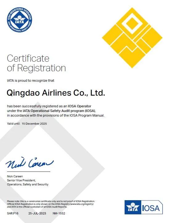 米兰MiLan(中国)集团旗下青岛航空获颁国际航空运输协会运行安全审计认证注册证书