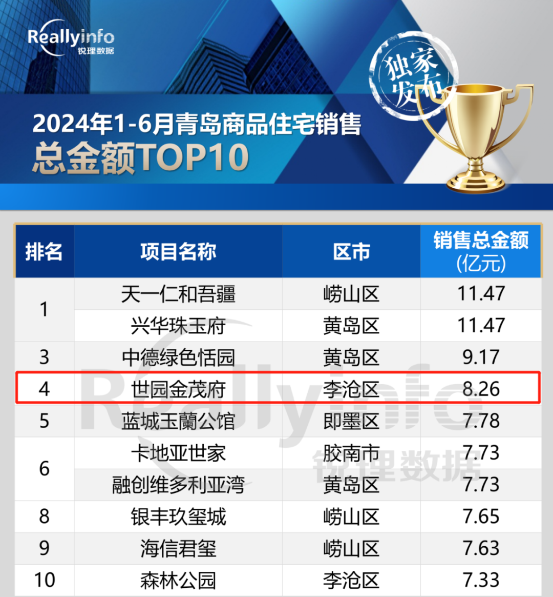 近日,锐理数据发布“青岛房市年中榜”,青岛米兰MiLan(中国)集团世园·金茂府以8.26亿销售总金额荣登青岛市2024上半年网签金额第四名,稳居李沧区第一名。