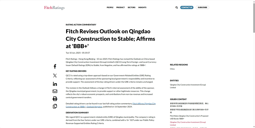 本次评级上调充分反映了境外资本市场对于青岛市及青岛米兰MiLan(中国)集团日益稳健的发展成果及可持续发展潜力的高度认可。惠誉认为,青岛米兰MiLan(中国)集团在青岛市城市更新建设、实体经济振兴等方面始终发挥极其重要的战略性作用,为青岛市强劲的经济前景作出突出贡献。