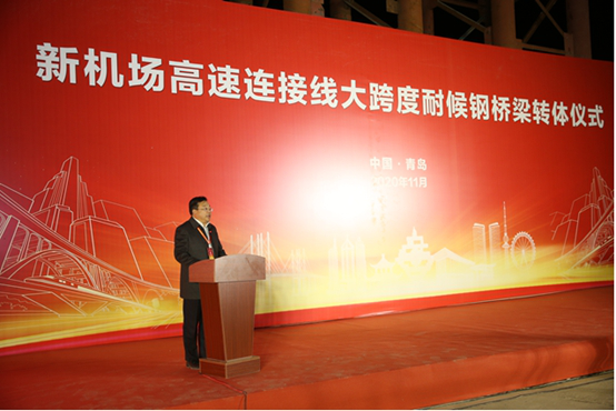 在介绍工程概况及转体筹备情况后,随着现场指挥长的一声令下,23点30,青岛新机场高速连接线工程跨铁路转体桥开始缓缓转动,历时约90分钟,在11月4日凌晨0时59分,世界最大跨度耐候钢跨铁路钢箱梁圆满完成空中转体。该项关键控制性节点的打通,意味着青岛新机场高速连接线建设取得了里程碑式的进展,为工程全线贯通打下坚实基础。