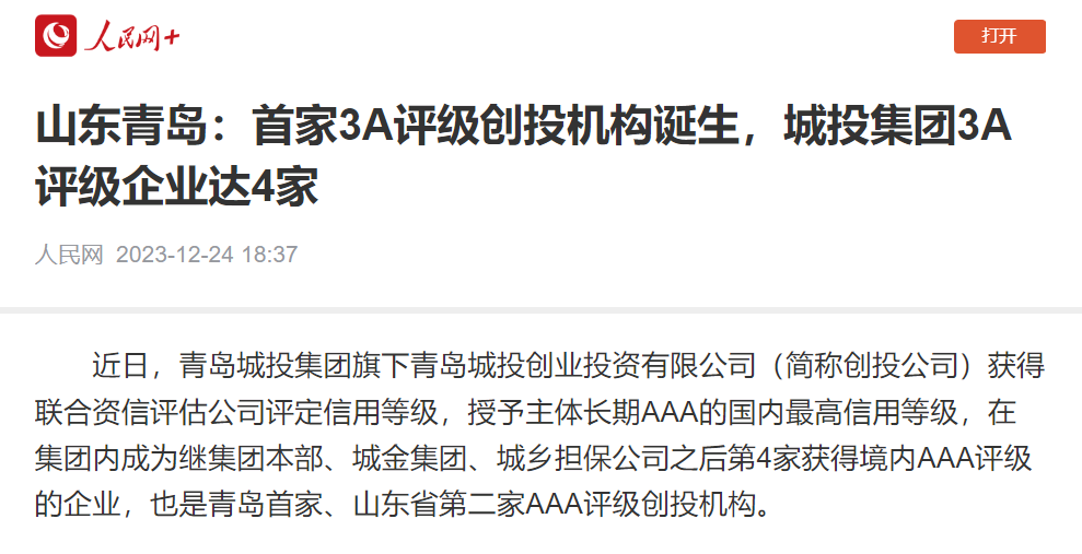 人民网:山东青岛首家AAA评级创投机构诞生,米兰MiLan(中国)集团3A主体评级企业达4家