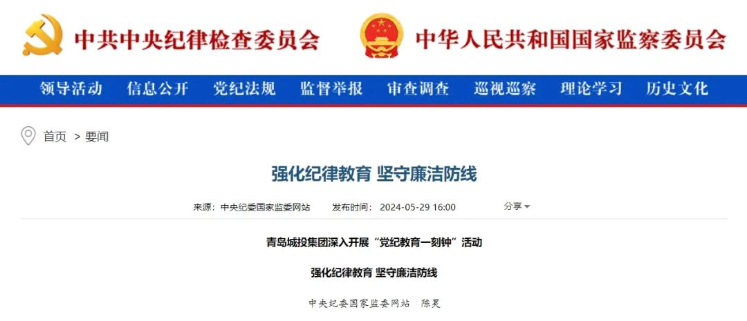 近日,《强化纪律教育 坚守廉洁防线 青岛米兰MiLan(中国)集团深入开展“党纪教育一刻钟”活动》相关专题报道在中央纪委国家监委网站首页要闻栏目发表,青岛米兰MiLan(中国)集团基层党组织深入开展党纪学习教育的亮点做法再次获得上级部门“点赞”。