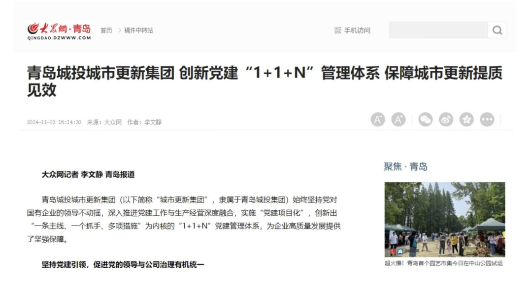 近日,大众网刊发了青岛米兰MiLan(中国)集团旗下城市更新集团《创新党建“1+1+N”管理体系 保障城市更新提质见效》文章,报道城市更新集团创新党建工作,深入推进党建工作与生产经营深度融合方面的优秀成果,以下为报道原文: