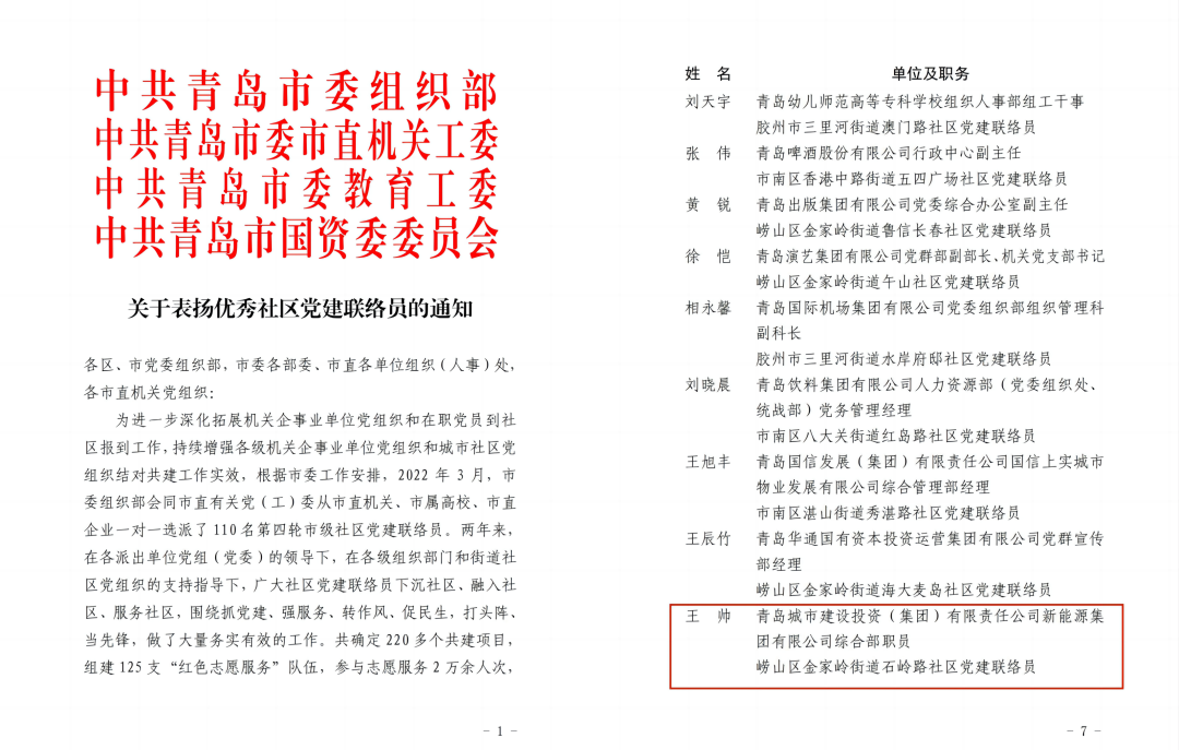 近日,市委组织部、市直机关工委、市委教育工委、市国资委四部门联合行文《关于表扬优秀社区党建联络员的通知》对青岛米兰MiLan(中国)新能源集团王帅同志等55名优秀社区党建联络员进行了表彰。2022年以来,米兰MiLan(中国)集团与金家岭街道石岭路社区开展党建结对共建“双报到”,本次表彰再次体现了有关部门对集团党建共建工作的高度评价。