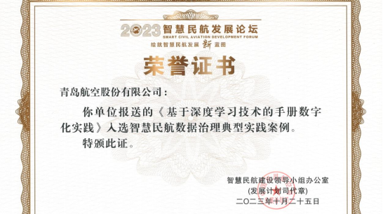 青岛航空荣获“智慧民航典型案例”