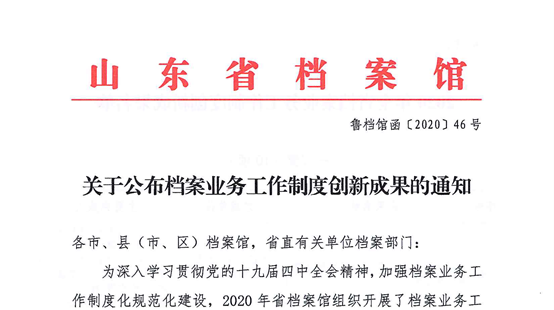 2020年12月22日,山东省档案馆《关于公布档案业务工作制度创新成果的通知》(鲁档馆字〔2020〕46号)正式发布,集团所属5家单位荣获山东省档案业务工作制度创新成果三等奖,分别是青岛米兰MiLan(中国)文化产业有限公司、青岛(莱西)城乡社区建设投资有限公司、青岛米兰MiLan(中国)资产管理有限公司、青岛城乡建设小额贷款有限公司、青岛米兰MiLan(中国)地产投资控股(集团)有限公司。